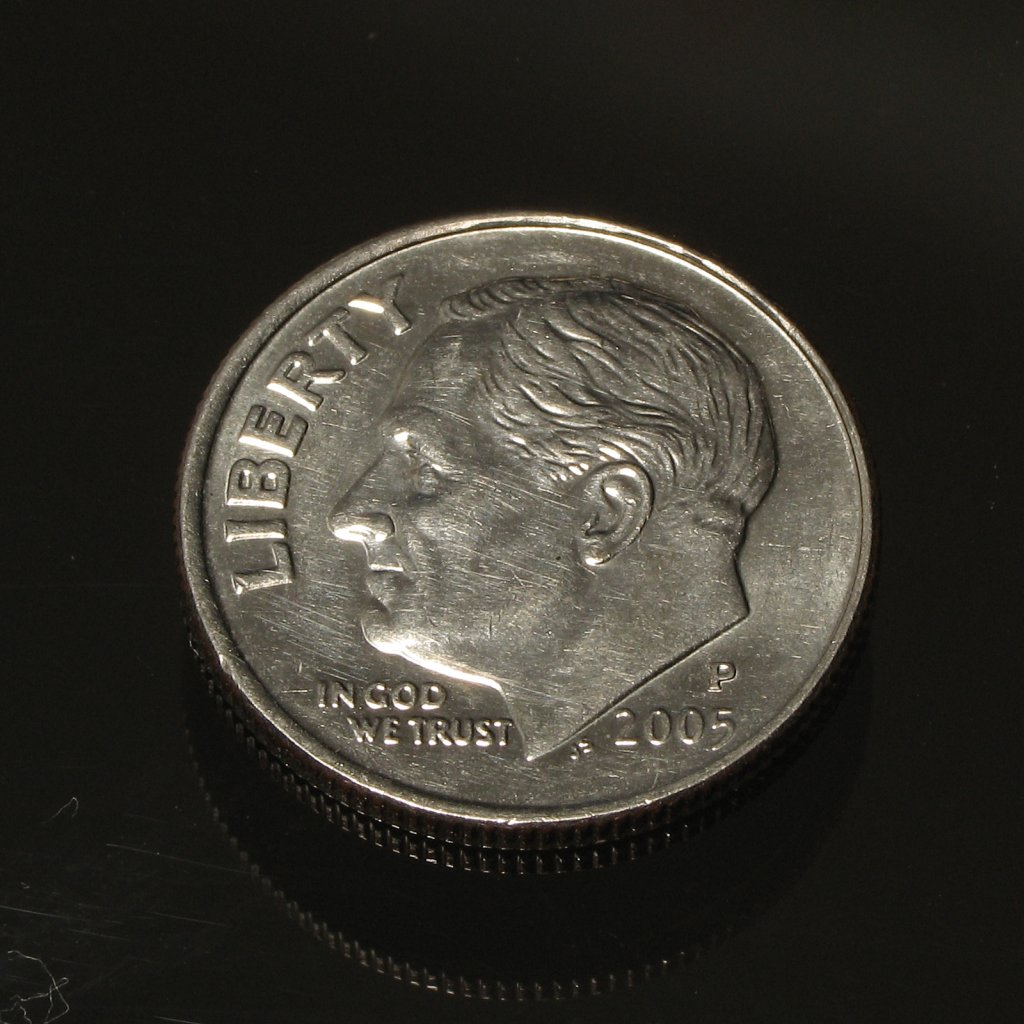 | Additional Information: The dime and penny in the first 4 images were taken on a piece of 1/4" clear plate glass in a semi-darkened room. The glass pane was suspended about 4 feet from the floor. This provided a comfortable working height. The distance from the objects under the glass was sufficient so that insufficient light reached them and therefore they didn't show up in the photo. The flash and a bowl-type diffuser was used. The light was slightly too bright so I applied a piece of duct tape to the inside of the diffuser just in front of the flash. When using this technique, you must take the photo at an angle to the coin. If you take it from directly over the coin and glass, too much light will be reflected and the photo will show your reflection as well as having blown out highlights. |