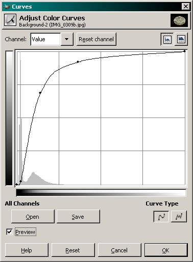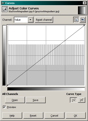 Before we begin, let me say that you can make a mess of a photo with this tool but when used properly, it can be very useful. To begin, I'll show you how the tool works with a grayscale sample. This makes it easier to understand the basic problems that can occur. To get to the tool... TOOLS >> COLOR TOOLS >> CURVES Here, you can see the sample of a black to white gradient on the left and the curves tool palette on the right. If you look at the histogram in the window, you can see that all variations (from black to white) in the entire spectrum are evenly represented.