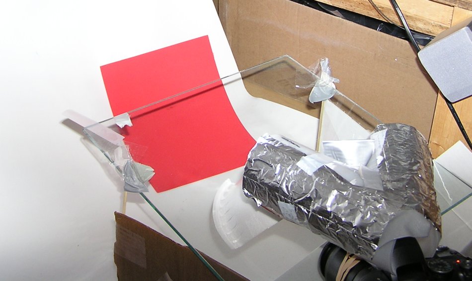 This page shows you some of the different color effects you can get using a simple piece of glass and some colored sheets. I used colored foam here but virtually any colored sheet will work. As is mentioned on the jewelry page, some objects don't look good when photographed on a colored surface. To prevent the background color from influencing the object's coloring, it's necessary to have the colored background well behind the object being photographed. This is easily and cheaply done with a simple pane of glass. The pane is supported below by a cardboard box. The back of the support is open. The area behind the support is covered by a sheet of vinyl. The vinyl isn't really needed but is provides a relatively continuous background free of distractions. These photos were taken in a darkened room. The lighting was bright enough that I could easily see what I was doing but the lighting was indirect so that it would not reflect off of the table. As you can see, the glass is at a slight angle (higher in the rear than in the front). This makes it a bit easier to get the background in the photo without seeing the rear edge of the glass. Please note that the glass being crooked on the supports is not intentional and makes no difference.