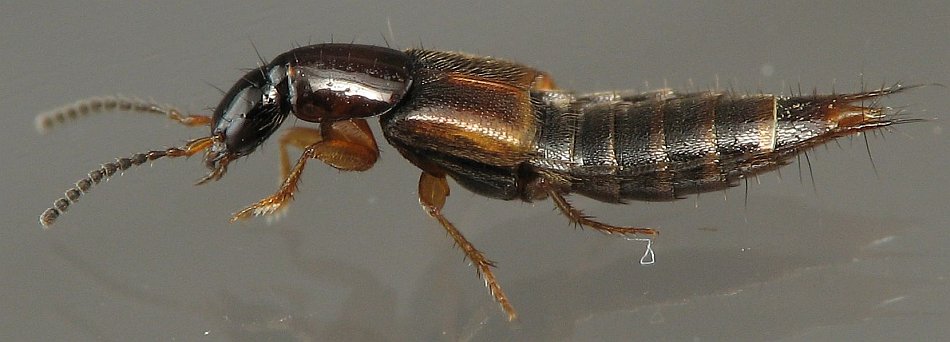 This is a rove beetle. Rove beetles are generally long skinny beetles. Some are mistaken for earwigs due to the cerci on the tips of their abdomen.
