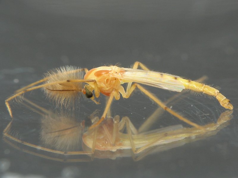- Set-up - This is the set-up I generally use. I place the individual on the larger part of the petri dish and place the other half on top to keep the individual from escaping while I'm not looking. When I need to take the photos, I remove the cover (carefully - so I don't startle it). I can check for the proper distance and even take a few test shots through the dish to see if the set-up is just about right. This petri dish is ~60mm in diameter. The Midge is ~8mm in length. It's always good to measure the individual. For most insects, the body length (not including wings, antennae or abdominal cerci) is what's important.