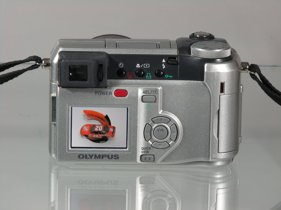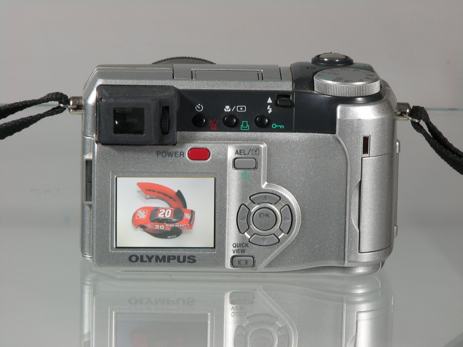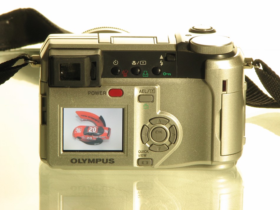 | Additional Information: In this photo, I set the color balance to manual and used the background of the displayed image to set the white balance. As you can see, the body of the camera is now gold. If you had time, you could use different lighting sources until you found something compatible with the light source for the display. If you want to cheat a bit, take one photo of the camera using the display to set the white balance then take a second photo of the camera with auto white balance (or whatever works best for the light source you have). Then use the GIMP or other photo editing software to cut the color-correct display and paste it into the color-correct body. If you're using a tripod and don't move it between photos, the cut/paste job will be relatively easy. This is what it would look like (~1 minute to cut and paste). Another option would be to take the actual photo and reduce it's size until it fit to the display window. This is what it would look like. This took a bit more time than the previous cut and paste job but it looks better. |