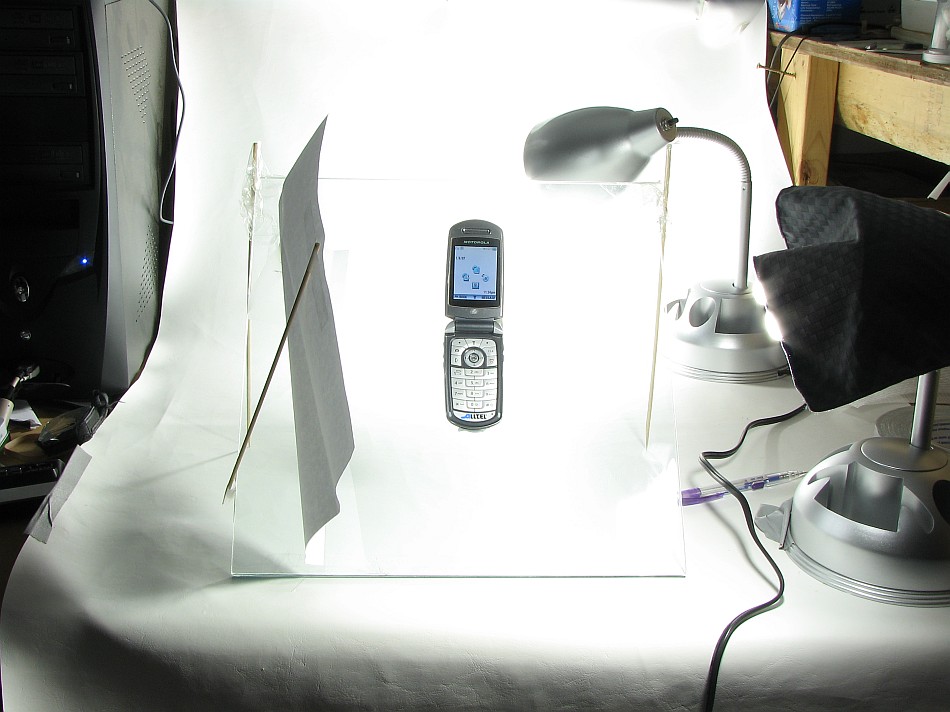 | Additional Information: In this configuration, the glass is at about 60°. The cell phone is held to the glass with blue-tack type poster adhesive. I use bamboo skewers (used for shishkabob) and packing tape to hold the glass at an angle. The lower edge of the glass is taped to the vinyl to prevent it from slipping. The pointy end of the skewers stick into the vinyl and won't slip unless placed at an extreme angle. The paper at the left is used as a reflector (to more evenly light the face of the cell phone). The rag over the light prevents lens flares.