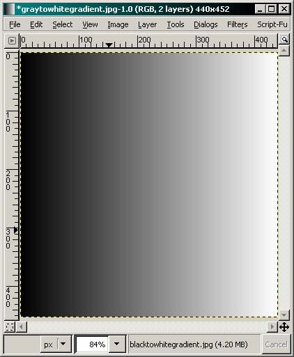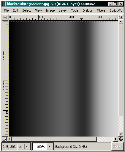 Before we begin, let me say that you can make a mess of a photo with this tool but when used properly, it can be very useful. To begin, I'll show you how the tool works with a grayscale sample. This makes it easier to understand the basic problems that can occur. To get to the tool... TOOLS >> COLOR TOOLS >> CURVES Here, you can see the sample of a black to white gradient on the left and the curves tool palette on the right. If you look at the histogram in the window, you can see that all variations (from black to white) in the entire spectrum are evenly represented.