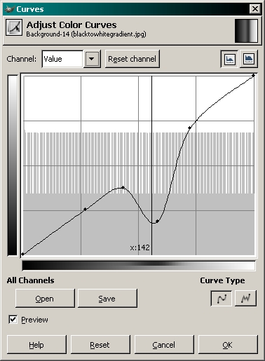 To understand this tool, you need to understand the tool window. The vertical grayscale bar is the output level. You can think of it as the 'after' level. The bottom half of the bottom grayscale bar is the input level. Think of it as the 'before' level. Before any changes are made, the line is straight. This means that the 'before' level at any point on the gradient is going to be the same as the 'after' level. If you select the center point on the line, moving it up will make the midtones in the image lighter. The lightest and darkest points will remain unchanged. When you make a part of the curve more vertical, you make the part of the spectrum under that part of the curve more contrasty. For example, when you move the center point of the line up, the tones darker than that point will have more contrast. The tones above that point will have less contrast and will be lighter. Adding more anchor points will allow you to make changes to various parts of the spectrum. It's best to make very small changes in the shape of the curve. Sharp vertical jogs in the line will result in overly contrasty/blotchy results in real-world images. Here, you can see the same gradient after the curve has been modified.