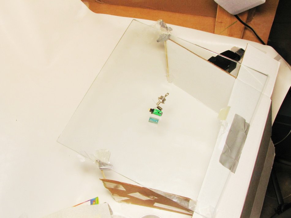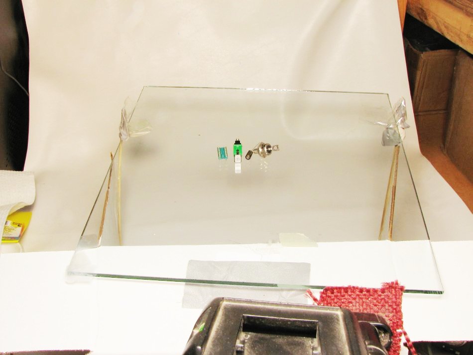 This page shows you some of the different color effects you can get using a simple piece of glass and some colored sheets. I used colored foam here but virtually any colored sheet will work. As is mentioned on the jewelry page, some objects don't look good when photographed on a colored surface. To prevent the background color from influencing the object's coloring, it's necessary to have the colored background well behind the object being photographed. This is easily and cheaply done with a simple pane of glass. The pane is supported below by a cardboard box. The back of the support is open. The area behind the support is covered by a sheet of vinyl. The vinyl isn't really needed but is provides a relatively continuous background free of distractions. These photos were taken in a darkened room. The lighting was bright enough that I could easily see what I was doing but the lighting was indirect so that it would not reflect off of the table. As you can see, the glass is at a slight angle (higher in the rear than in the front). This makes it a bit easier to get the background in the photo without seeing the rear edge of the glass. Please note that the glass being crooked on the supports is not intentional and makes no difference.