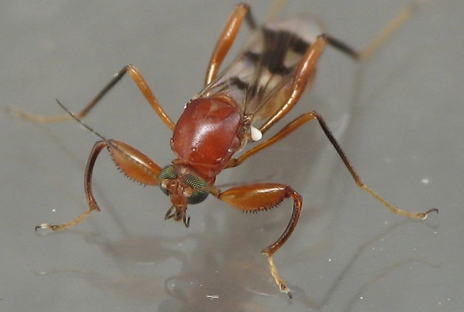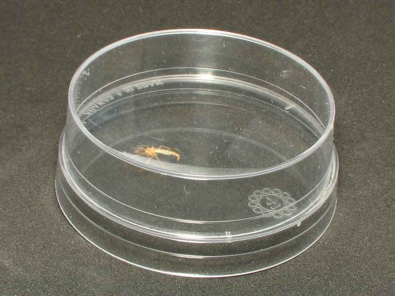 - Bottom - Not Taken. There are generally two ways to photograph the bottom of an individual. If the insect is dead or chilled, you can take it directly. If the insect is active, you can generally take it through the bottom of the container (assuming that you're using clear containers). In a few instances, I've placed a specimen between two lenses. To provide added clearance, I removed the lens from an old UV filter and placed the metal ring between the other lenses. This worked well with +1 and +2 diopter lenses but didn't work well when one of the lenses was a UV filter. I'm not sure why the UV filter caused problems but it certainly did not produce any high quality photos. In the petri dishes, if you can get the individual on the curved side of the dish, the flash is less likely to bounce back into the lens.