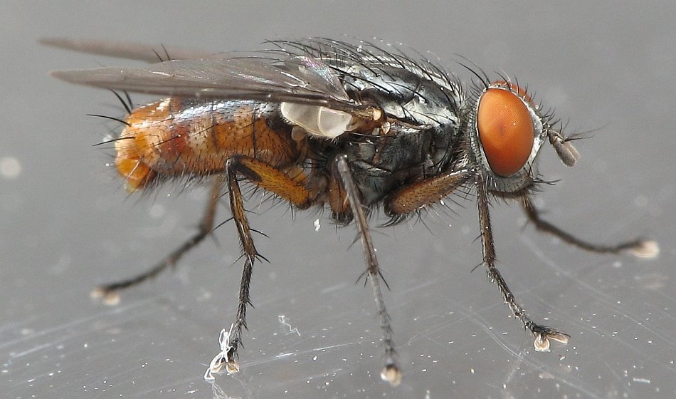 This was identified as a flesh fly. There is a row of hairs just above it's rear leg that help solidify the ID. The most common way to ID them is by the 3 dark stripes on their thorax. THIS is a full series for another flesh fly.