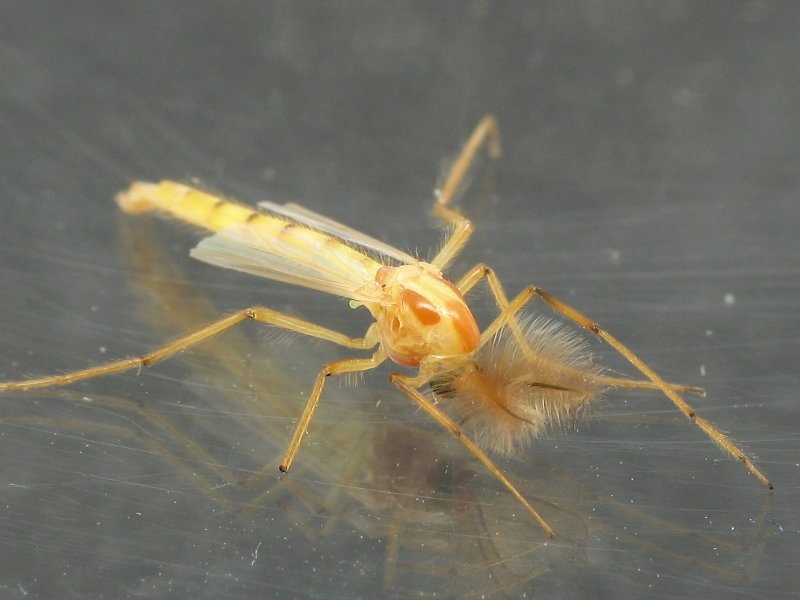 - Set-up - This is the set-up I generally use. I place the individual on the larger part of the petri dish and place the other half on top to keep the individual from escaping while I'm not looking. When I need to take the photos, I remove the cover (carefully - so I don't startle it). I can check for the proper distance and even take a few test shots through the dish to see if the set-up is just about right. This petri dish is ~60mm in diameter. The Midge is ~8mm in length. It's always good to measure the individual. For most insects, the body length (not including wings, antennae or abdominal cerci) is what's important.