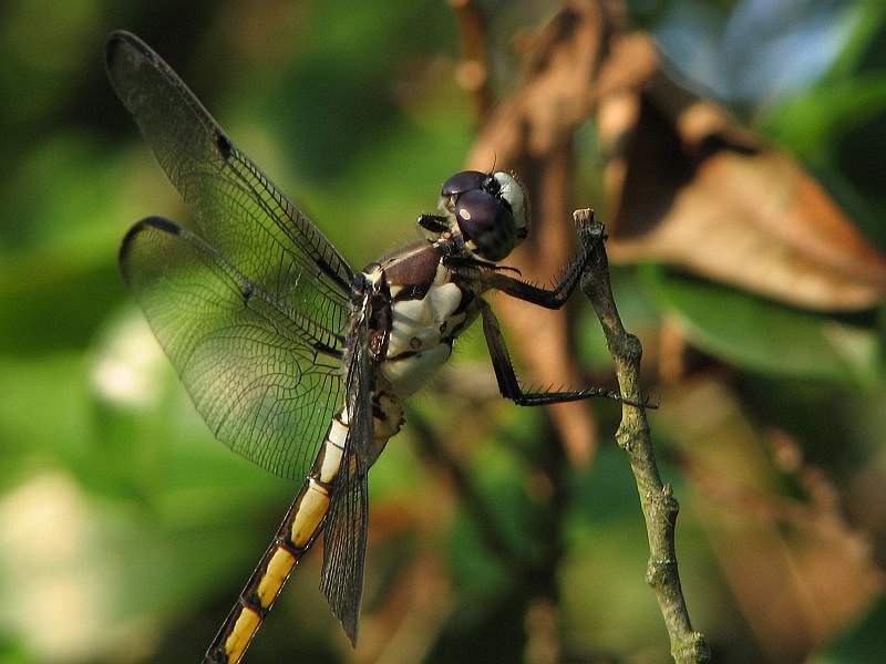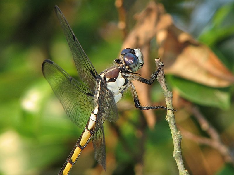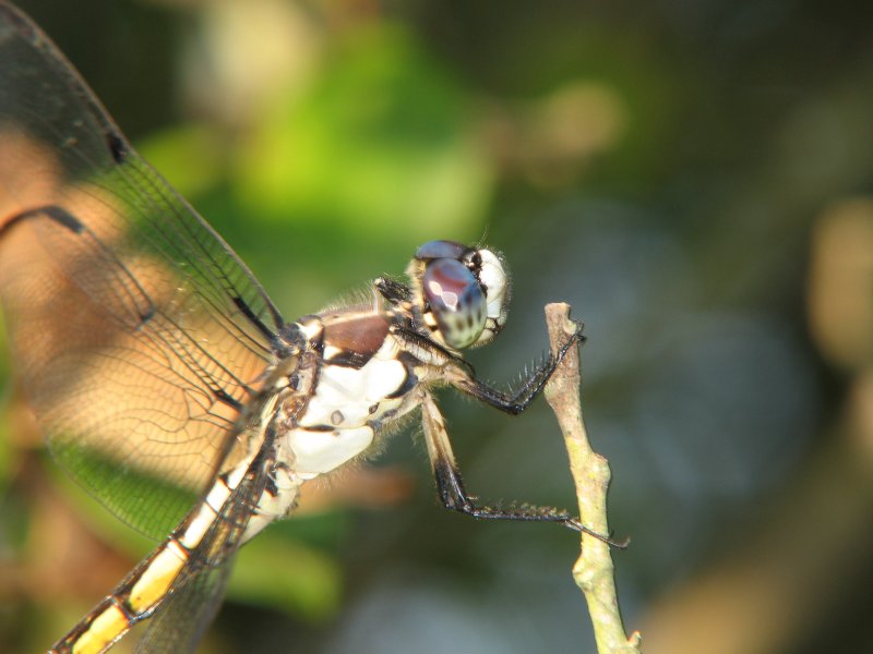 In the next two images, I used the same setting (1/60 sec and F6.3). These were good enough for the lighting conditions but you can see that much of the dragonfly is too dark. For the second photo, I used the flash. Luckily, the subject was relatively cooperative so I had several chances to get the proper working distance for the flash (so it wasn't too intense). When I found the proper working distance, I took both photos. When I was closer, the flash blew out the lighter areas of the thorax.