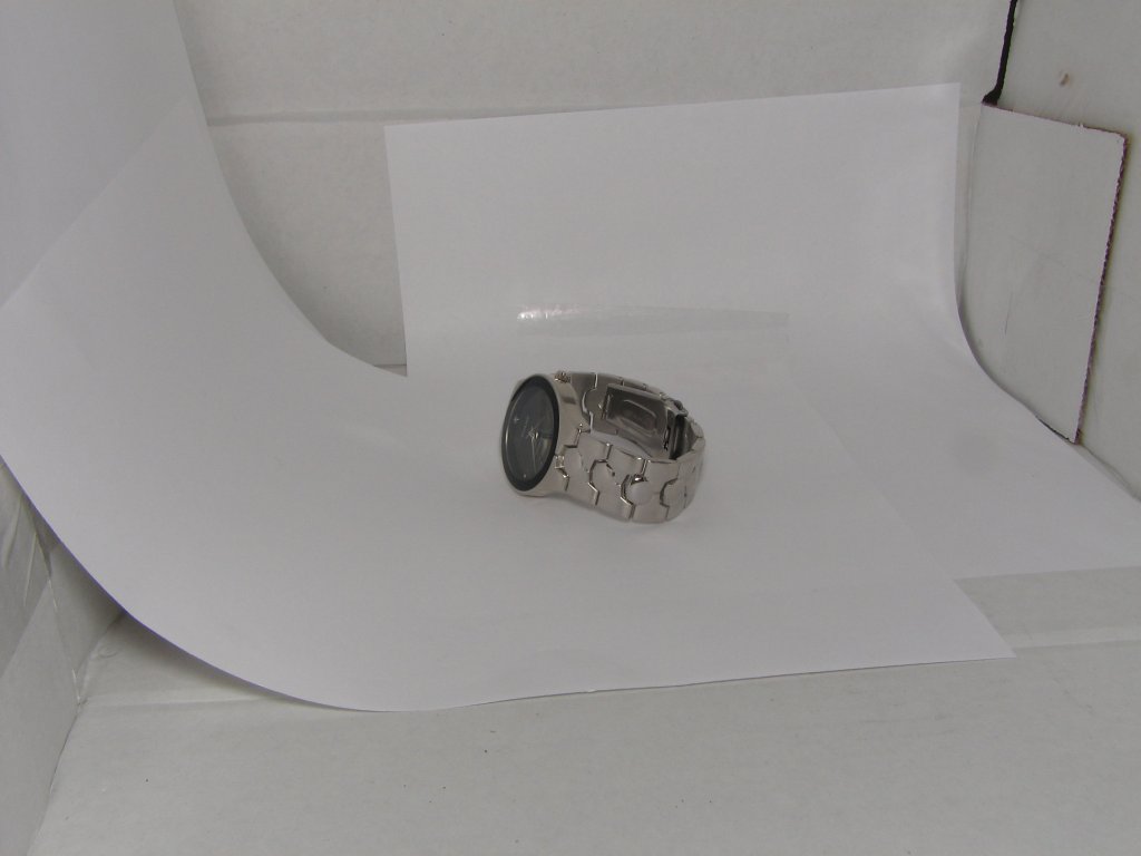 | Additional Information: This shows the placement of the watch in the enclosure. If you look under the watch, you can see that one piece of paper sweeps from the bottom of the box to the side of the box. This is the piece of paper that was creating the single line on the watch crystal. I added another piece of paper behind it to provide a continuous surface of the same exact color and texture. I also added a sweeping piece of paper in the rear of the enclosure. This prevented the camera from photographing the square corner in the rear of the enclosure. When I initially placed it there, the line where the bottom and rear pieces of paper met showed a line. I used some clear packing tape to join the two and the line disappeared in the photos (what you can see isn't always what the camera sees). |